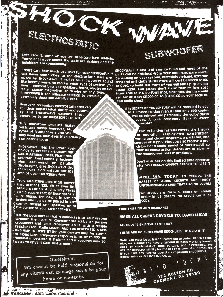a few discount coupons for other ESL (electrostatic loudspeaker) related items carried by David Lucas, the licence agreement,